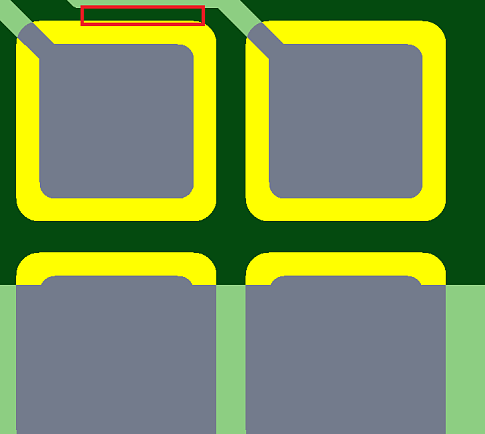 Зазор между окном в паяльной маске и проходящей рядом линией минимален. Возможно частичное вскрытие соседнего элемента топологии от паяльной маски, что может привести к замыканию при монтаже. Изготовление ВОЗМОЖНО, но с повышающим коэффициентом. Без доработки проекта изготовление НЕВОЗМОЖНО, т.к. высока вероятность вскрытия из-под маски участка топологии!